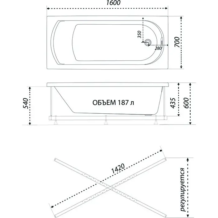 Акриловая ванна 1ACReal Дюна Щ0000046662 160x70 см на Х-каркасе белый