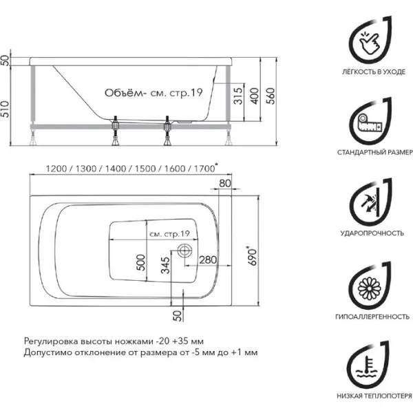 • Стандартные размеры, см: