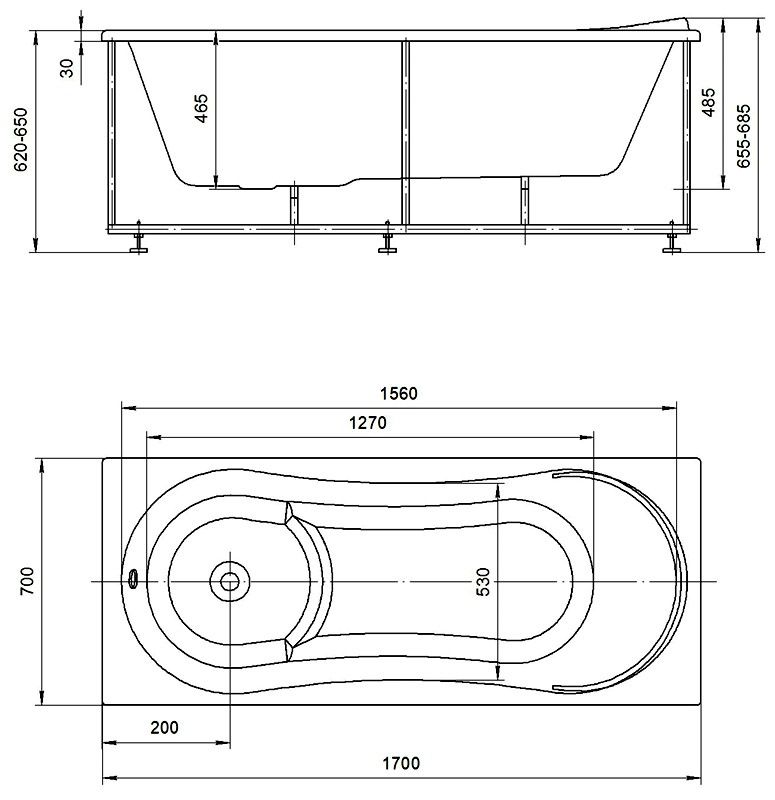 Длина, см:170Ширина, см:70Высота, см:65,5–68,5Глубина, см:46,5Форма:ПрямоугольнаяВнутр. размер дна, см:127Внутр. размер ванны, см:156Внутренняя ширина, см:56Макс. емкость, л:220Вес, кг:45-