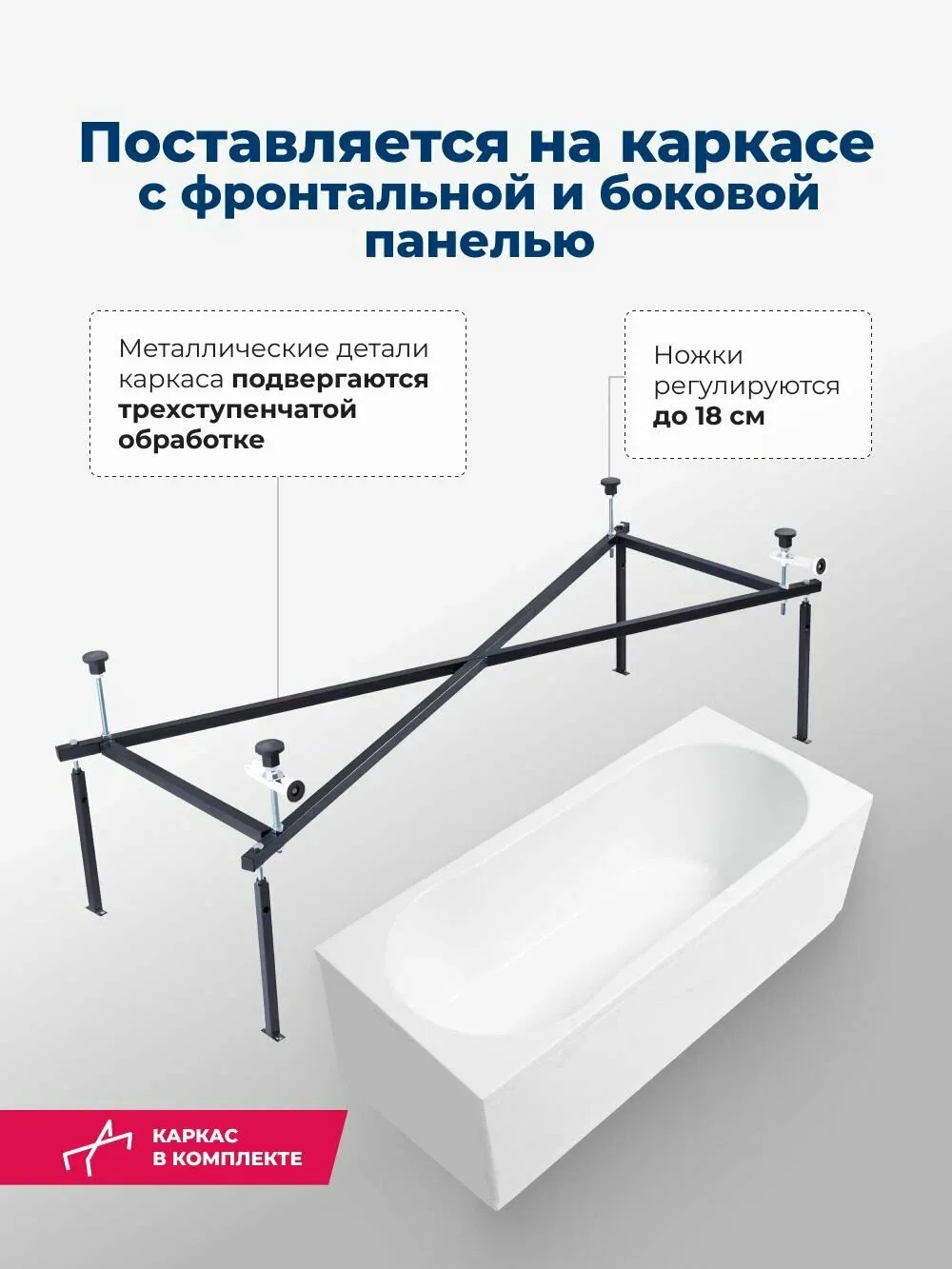 Ванна уже установлена на жесткий сварной каркас из металлического профиля. Металлические детали каркаса подвергаются трехступенчатой обработке, когда сначала профильная труба проходит абразивную зачистку на специальном станке, после чего готовые детали обрабатывают каустической содой, и, просушив, покрывают с помощью электростатического распылителя молотковой краской по металлу. Это гарантирует равномерность окрашивания и стойкость покрытия.