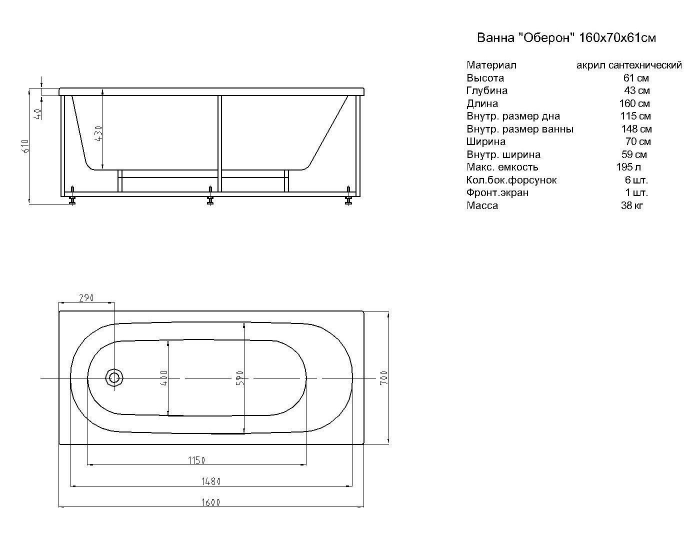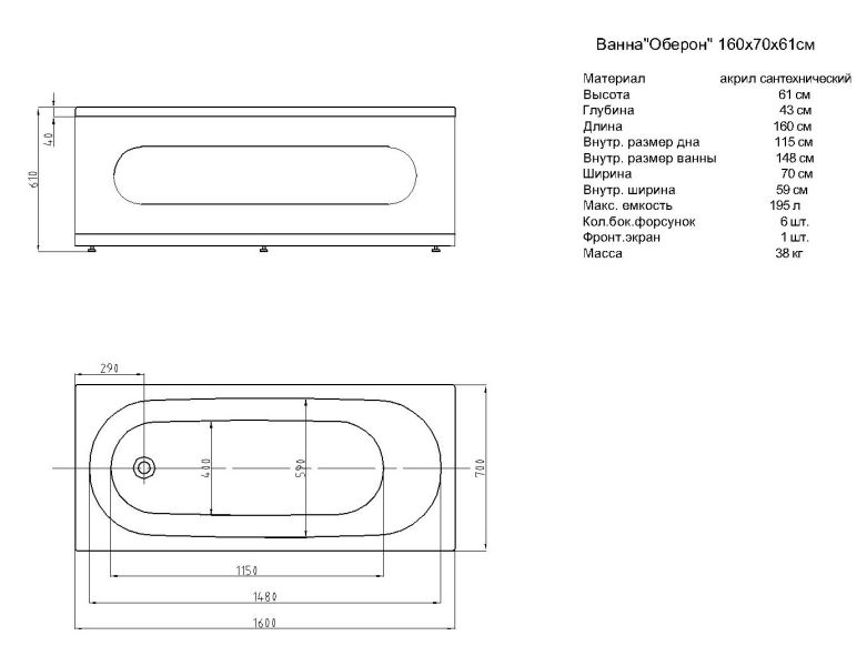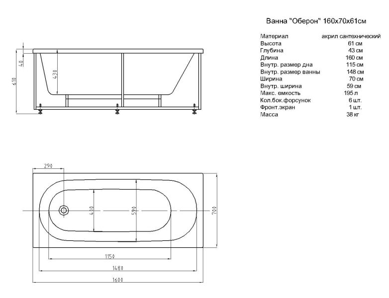 Габариты (Д Ш), см: 160х70Высота с опорой, см: 61Объем, л: 195 Форма: прямоугольнаяМонтаж: пристеннаяРасположение перелива: стандартноеДиаметр слива ванны, см: 5,2Материал: 100% литьевой акрилТолщина акрилового листа, мм: 4Гарантия: 20 летСтрана: Россия Вид опоры: каркас сборно-разборный сварной, есть в комплектеЭкран: фронтальный в комплектеСлив-перелив: есть, в комплектеАнтискользящее покрытие: нескользкая поверхностьПодголовник: приобретается отдельноРучки: приобретаются отдельно Система гидромассажа: установка по желаниюАэромассаж: установка по желаниюХромотерапия: установка по желаниюРучки, поручни для ванны: установка по желаниюВстроенные смесители: установка по желаниюИзменение конструкции каркаса: установка по желаниюОзонирование: нет, установка не предусмотренаЗащита от сухого пуска: установка по желаниюУправление: любое по желанию
