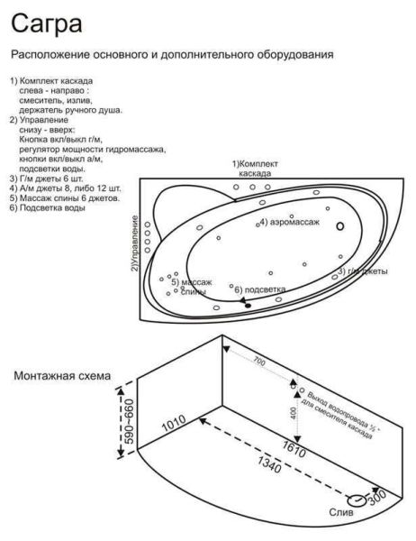 • Аэромассаж 8 форсунок, аэромассаж 12 форсунок, аэромассаж гидро-аэро-турбо (при наличии аэромассажа);