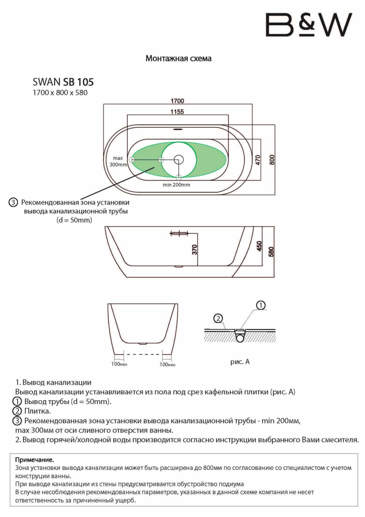 Акриловая ванна Black & White Black Swan 105SBBL 170 x 80 смКоллекция ванн с широким рядом форм и размеров представлена специально для выбора оптимального варианта с уклоном на личные предпочтения и возможности помещения.Современный дизайн и эргономичность форм.