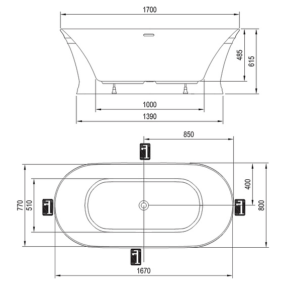 Ванну нельзя дополнить шторой для ванны. Все коммуникации должны прокладываться ниже уровня пола (сток, выводы холодной/горячей воды для напольного смесителя).