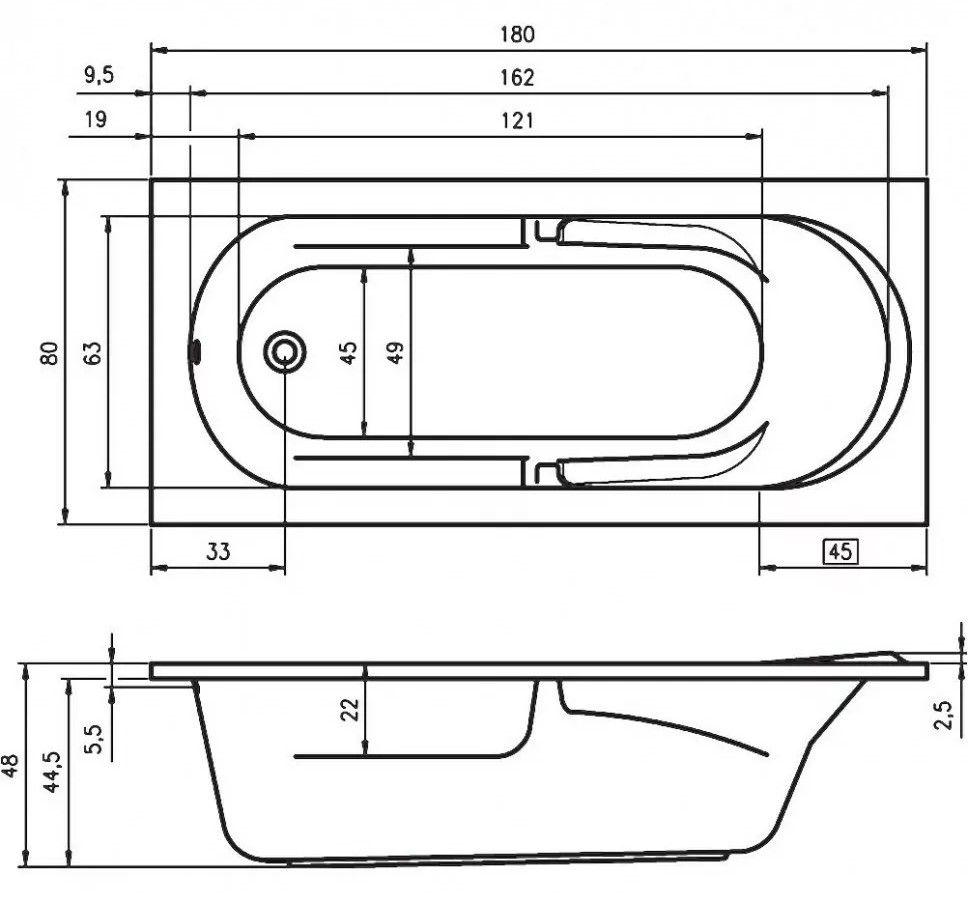 Традиционное боковое расположение слива в ногах, эргономичная форма чаши идеальны для использования одним человеком.