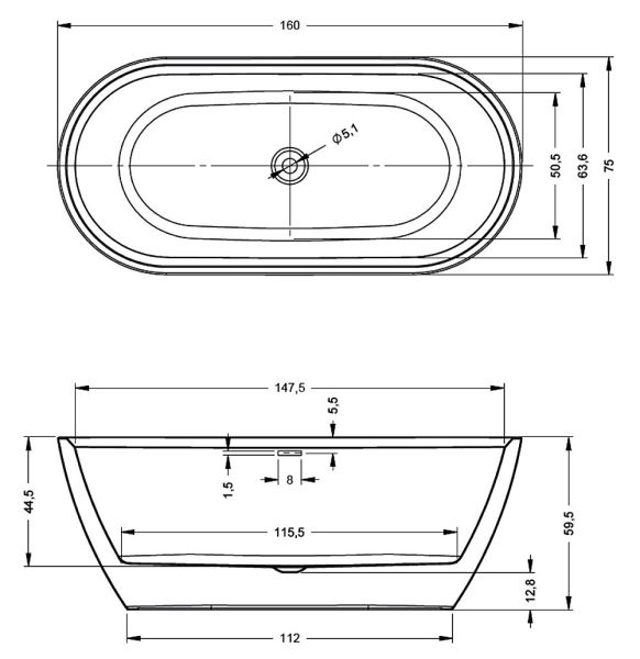 Отдельно стоящая, глянцевая белая акриловая ванна RIHO Inspire 160х75 FALL (заполнение через перелив) с двойными стенками, со встроенным переливом и нажимным донным клапаном.