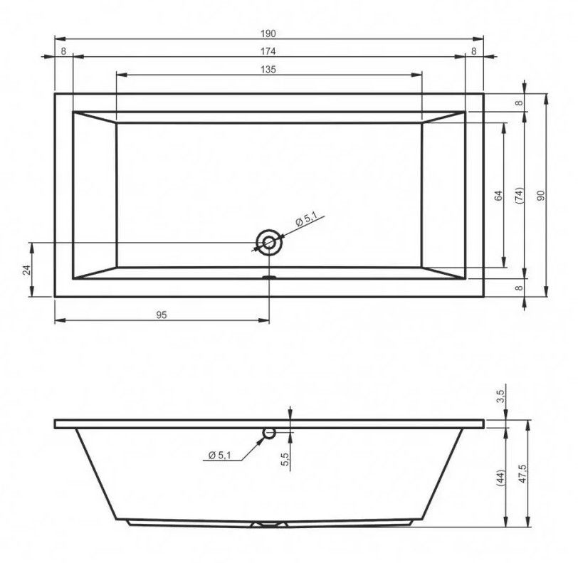 Дно широкое и почти полностью плоское, что позволяет удобно стоять в этой ванне.