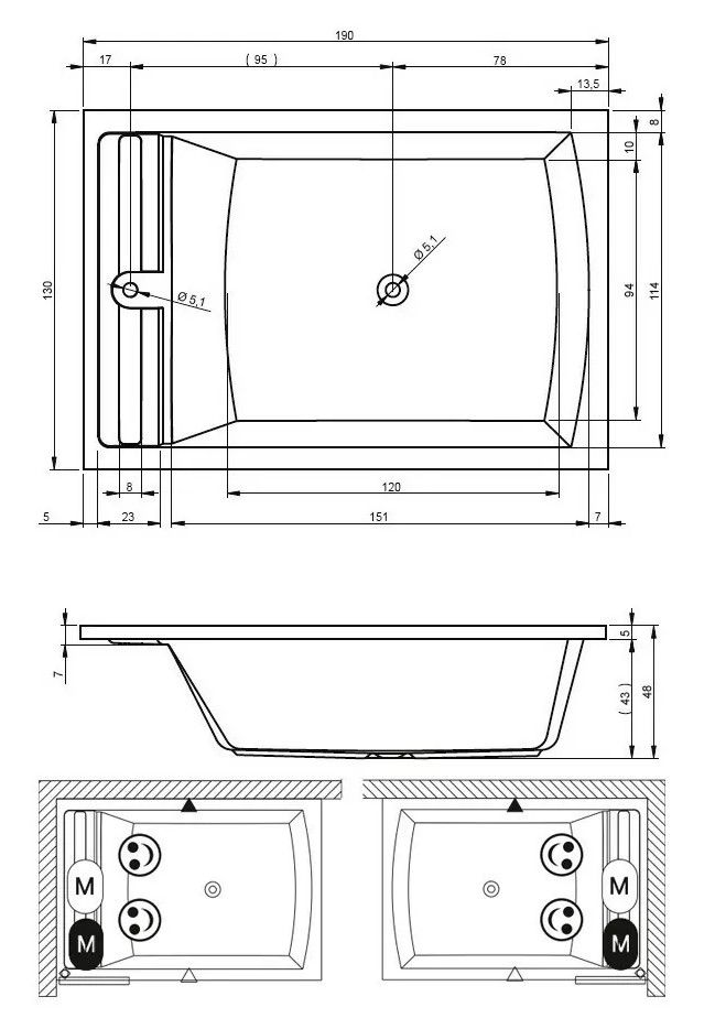 Прямоугольная акриловая ванна RIHO SAVONA 190x130 изготовлена из высококачественного листа акрила глянцевого белого цвета
