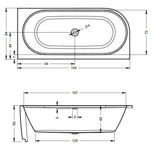 Асимметричная глянцевая белая акриловая ванна RIHO DESIRE CORNER 184х84 L LED (радиусная часть слева) с двойными стенками, со встроенным переливом и нажимным донным клапаном.