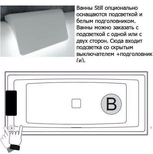 Акриловая ванна с подсветкой Riho Still Square LED Fall B100034005 170х75см светодиоды и подголовник слева заполнение через перелив белый