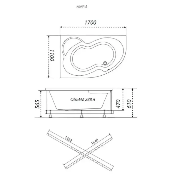 Акриловая ванна Triton Мари Щ0000046667 правая 170x110 см на Х-каркасе белый