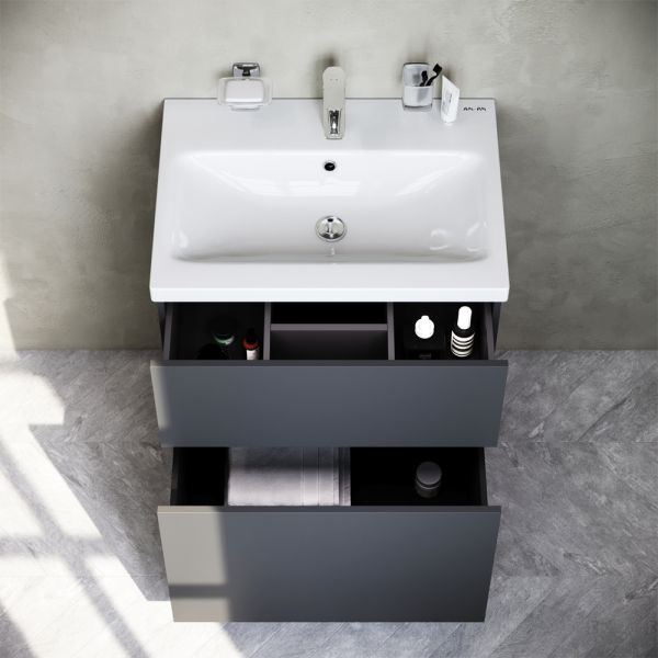 Подвесная мебель для ванной Am.Pm GEM идеально подойдет тем, кто предпочитает минимализм в интерьере и выбирает абсолютный комфорт. Современный европейский дизайн от DanelonMeroni (Великобритания/Италия) Самая компактная и функциональная раковина на рынке: проекция всего 42 см при максимальной глубине чаши!Фурнитура push-to-open - открывание ящика нажатием на фасад. Ящики с антискользящим покрытием цвета антрацит – европейский стандарт.