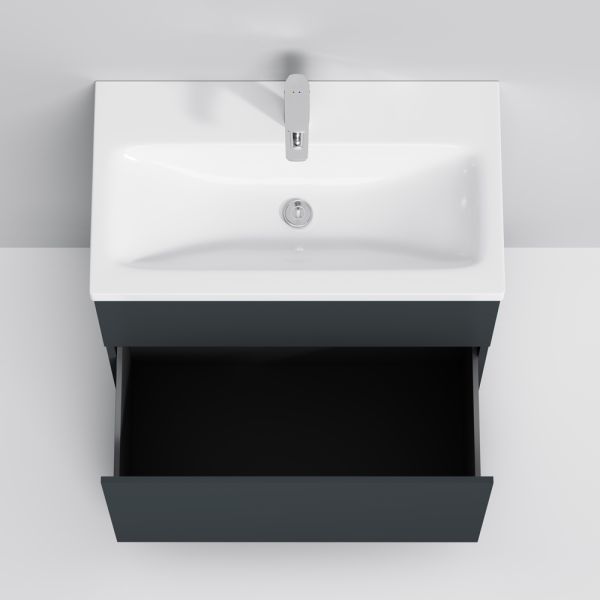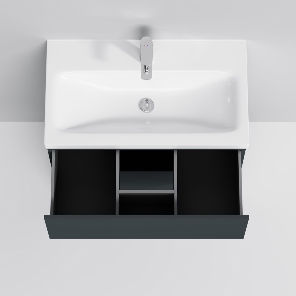 Подвесная мебель для ванной Am.Pm GEM идеально подойдет тем, кто предпочитает минимализм в интерьере и выбирает абсолютный комфорт. Современный европейский дизайн от DanelonMeroni (Великобритания/Италия) Самая компактная и функциональная раковина на рынке: проекция всего 42 см при максимальной глубине чаши!Фурнитура push-to-open - открывание ящика нажатием на фасад. Ящики с антискользящим покрытием цвета антрацит – европейский стандарт.
