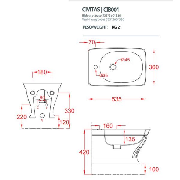 Биде Artceram CIVITAS CIB001 34 00 grigio acquarello*1 grigio acquarelloArtceram CIVITAS Биде подвесное 36х54 см, с крепеж. с 1 отв под смес, цвет grigio acquarello