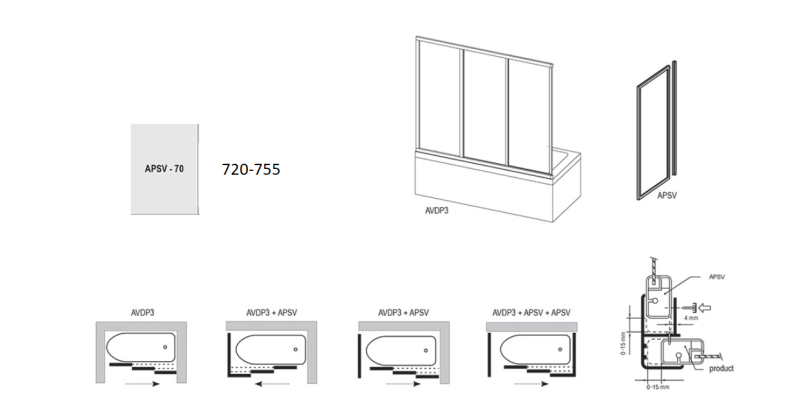 Неподвижная часть, которая не используется самостоятельно, а лишь в комбинации с дверьми для ванны AVDP3. Позволяет создать полностью герметичное душевое пространство вокруг ванны.