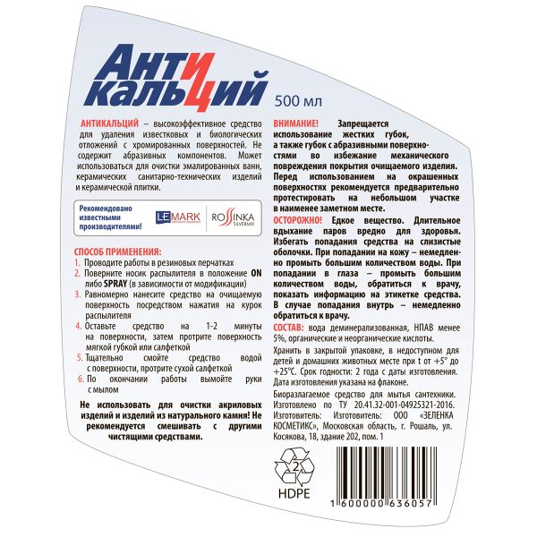 Чистящее средство Lemark Антикальций LM8901A, 500 мл.Подходит для смесителей и других хромированных изделий, а также форсунок гидромассажных систем.АНТИКАЛЬЦИЙ – высокоэффективное средство для удаления известковых и биологических отложений с хромированных поверхностей. Не содержит абразивных компонентов. Может использоваться для очистки эмалированных ванн, керамических санитарно-технических изделий и керамической плитки.Рекомендовано производителем смесителей Lemark, Rossinka Silvermix, Decoroom.СПОСОБ ПРИМЕНЕНИЯ: