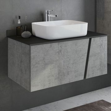 Тумба укомплектована столешницей и плинтусом из черного керамогранита и накладной прямоугольной раковиной Comforty T-Y9378. Корпус и фасады тумбы изготовлена из влагостойкого ДСП цвета "Бетон светлый". Тумба подготовлена для подключения водоснабжения снизу.