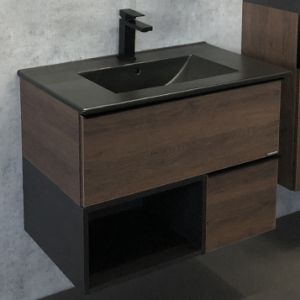 Comforty Тумба-умывальник "Франкфурт-75" дуб шоколадно-коричневый с раковиной COMFORTY 75E черная матовая