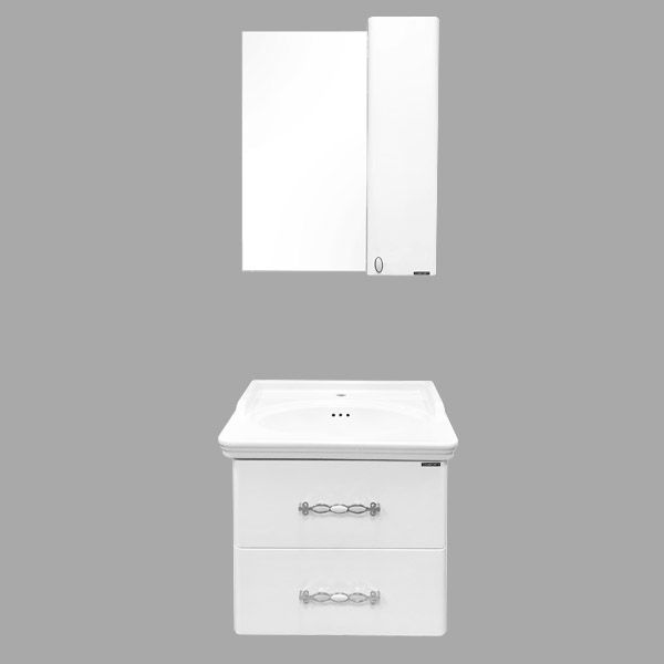 Тумба-умывальник с двумя выкатными ящиками, оснащенными системой плавного закрывания. Фасады выполнены из МДФ и покрыты белой глянцевой эмалью. Раковина с овальной чашей и оригинальными отверстиями перелива.