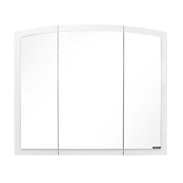Створки оснащены петлями с плавным закрыванием. Высококачественное зеркальное полотно с амальгамой на основе серебра. Боковые стенки покрыты белой глянцевой эмалью. Две боковые створки открываются наружу, у центральной створки петли справа. Название: Шкаф-зеркало