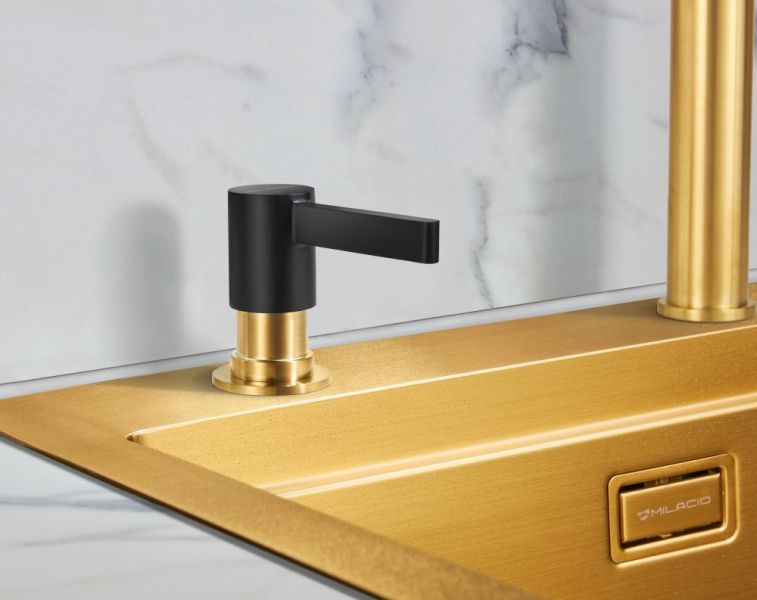 - Сатинированная ( брашированная ) текстура золота и матовая текстура черного цвета позволяет устанавливать дозатор Milacio как с каменными мойкам, так и в паре с мойками из нержавеющей стали с PVD покрытием любых брендов.