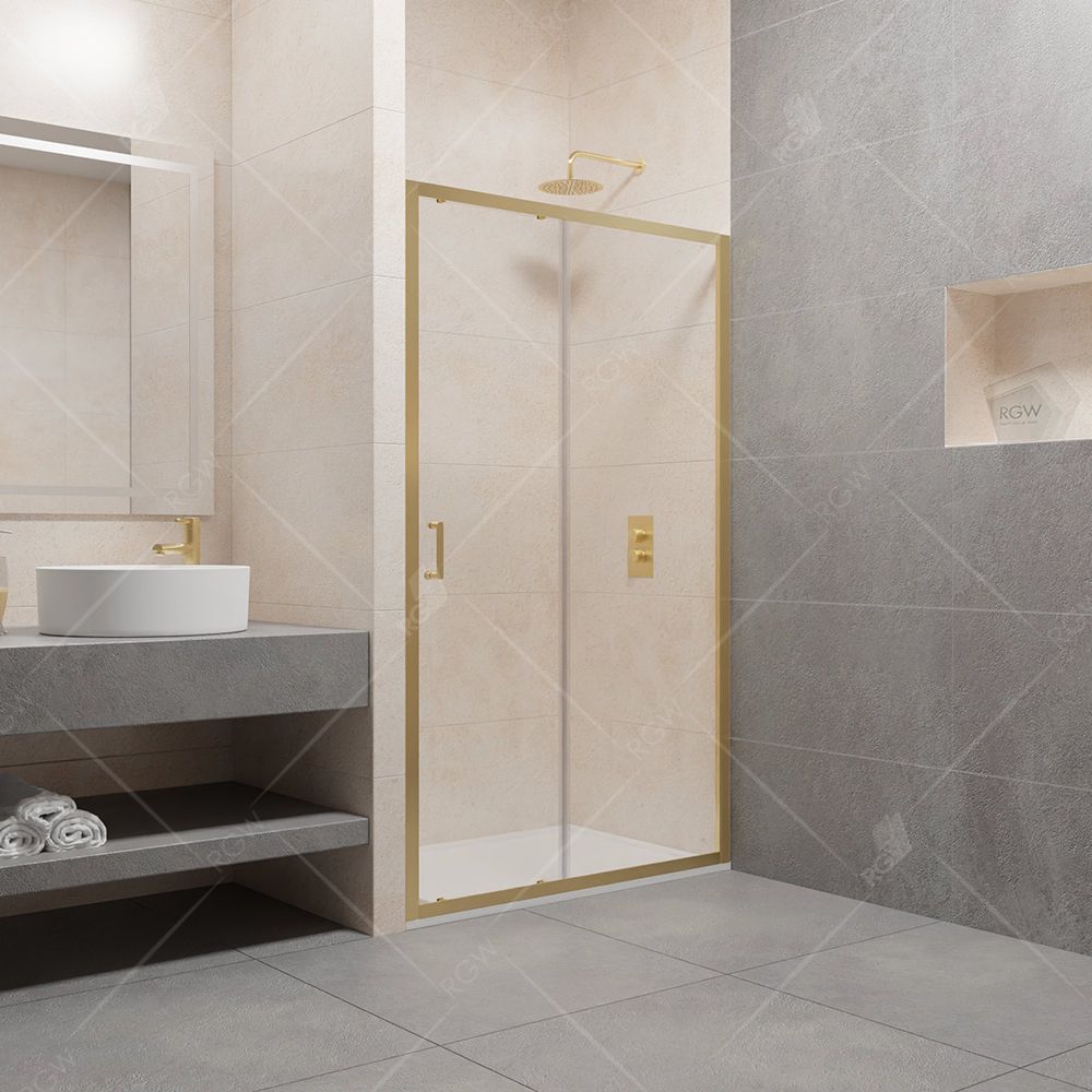 Душевая дверь раздвижная RGW PA-14. Ручка скоба из цинкового сплава, двойные верхние ролики. двойные отстегивающиеся нижние ролики, крышки верхнего профиля. Трап или поддон приобретается отдельно.Душевая дверь RGW Passage PA-14G профиль золотой незаменимый элемент любой ванной комнаты от миниатюрного санузла в многоквартирной высотке, до огромного помещения в загородном доме. Внутри ниши за душевой дверью можно разместить качественную сантехнику на ваш выбор, установить современную душевую стойку или встроить душевую систему скрытого монтажа, а также повесить удобные полочки для банных принадлежностей.Душевая дверь RGW Passage прямоугольной формой размером 140 см высотой 195 см создаст значительное пространство внутри, для вашего комфорта. Цвет профиля RGW Passage - золото, это бесподобный вариант для современного интерьера. Конструкция дверей раздвижная, не требует дополнительного пространства для открывания и позволяет оптимизировать пространство ванной комнаты. Стекло у душевой двери RGW представлено в прозрачном исполнении, толщиной 6 мм, отлично будет гармонировать с любым дизайном интерьера ванной. Универсальность ориентации RGW Passage позволяет не задумываться о, том в какой именно угол нужно устанавливать, и даже при изменении положения других элементов сантехники, можно без проблем изменить ориентацию. RGW Passage спроектирован дизайнерам с четким соблюдением всех значительных элементов современного стиля. Наличие покрытия анти-капля надежно защитит стекло от налета, подтёков и других загрязнений, а так же сохранит чистоту стекла и эстетичный внешний вид.Все душевые ограждения RGW, производятся с жестким соблюдением современных стандартов качества и применение материалов безопасных для здоровья, благодаря тому, что родна производства Германия. Душевая дверь RGW Passage PA-14G профиль золотой гармонично вольется в ваш интерьер и подарит ему дополнительные современные элементы.