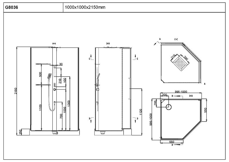 Габариты душевой кабины (ШхВхД): 1000х2150х1000 мм.