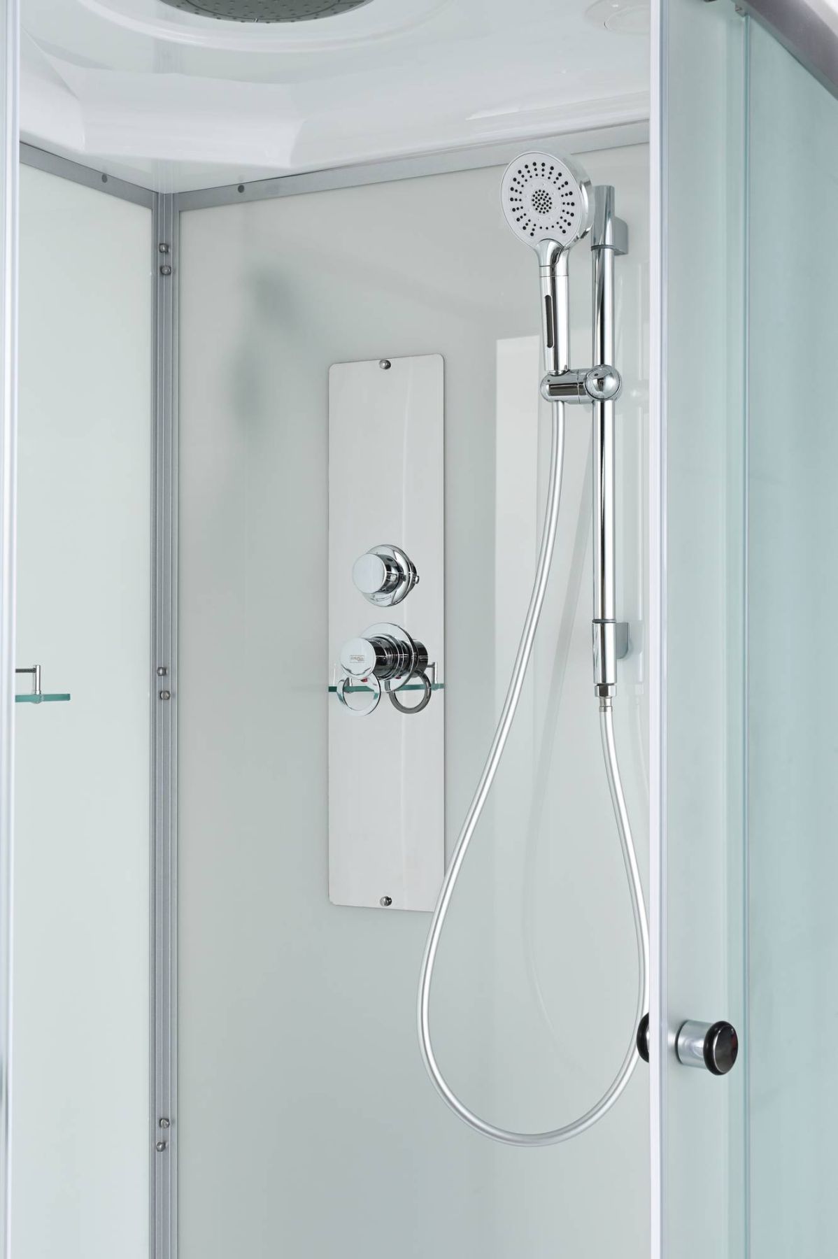 Стильная душевая кабина AvaCan D 2080  сочетает в себе высокую функциональность, практичность и надежность. При изготовлении применяется безопасное закаленное стекло толщиной 4 мм (матовое), надежно фиксируемое алюминиевым профилем. Сборка без силикона (увеличивает срок службы), внутренняя сборка (облегчает установку и ревизию, позволяет установить душевую кабину в ограниченном пространстве),смеситель резьбовой (без хомутов), съемный экран поддона (позволяет осуществлять ревизию сифона), цвет профиля матовый хром. Двойные металлические ролики дверей (увеличивают срок службы).В комплекте : душевая штанга, полочка, тропический (верхний) душ, арома-лейка с витамином С (картридж съемный).