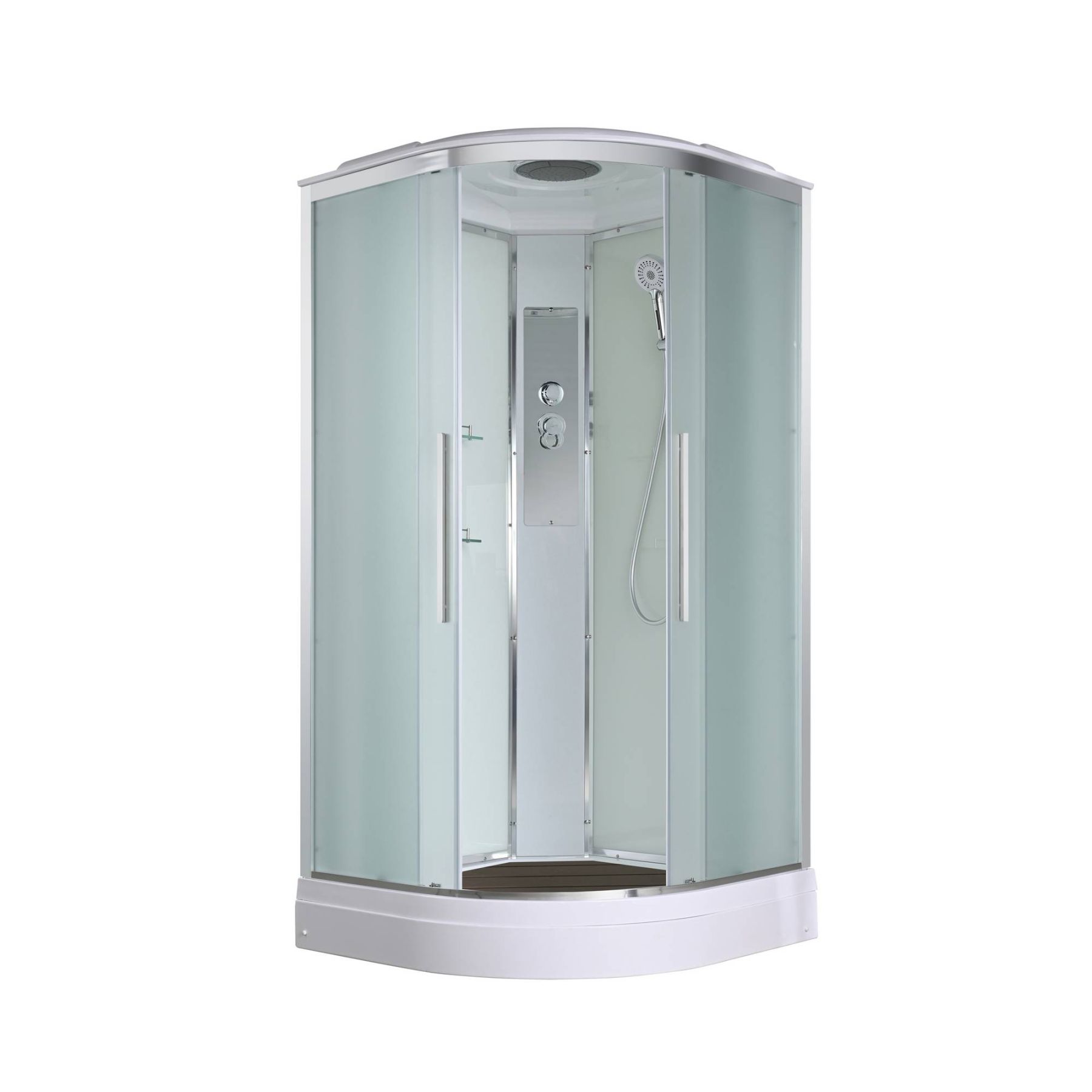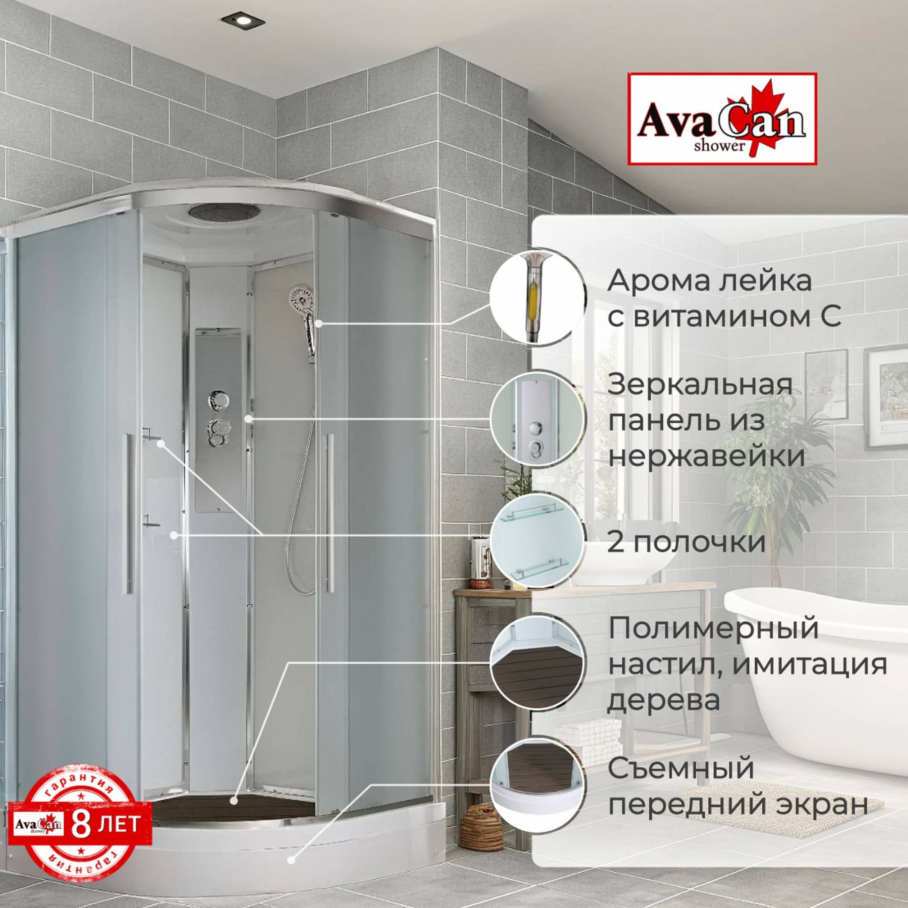 Стильная душевая кабина AvaCan EM2090 сочетает в себе высокую функциональность, практичность и надежность. При изготовлении применяется безопасное закаленное стекло толщиной 5 мм (матовое), надежно фиксируемое алюминиевым профилем. Сборка без силикона (увеличивает срок службы), внутренняя сборка(облегчает установку и ревизию; позволяет установить в ограниченном пространстве), смеситель резьбовой (без хомутов). Съемный экран поддона (позволяет осуществлять ревизию сифона). Цвет профиля  хром. Двойные металлические ролики дверей (увеличивают срок службы).В комплекте : душевая штанга, две полочки , тропический (верхний) душ, арома-лейка с витамином С (картридж съемный),полимерная вставка в поддон(имитация дерева),сифон, ручки дверей из нержавейки , двойные ролики .