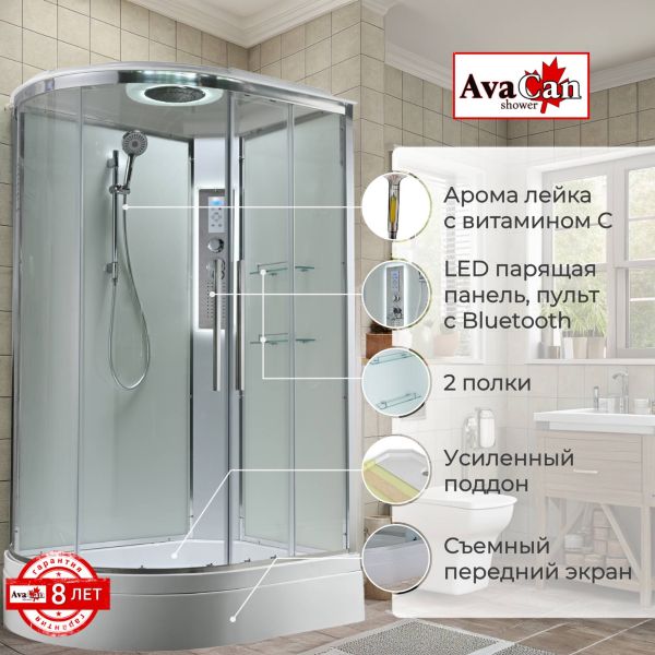Стильная душевая кабина AvaCan сочетает в себе высокую функциональность, практичность и надежность. При изготовлении применяется безопасное закаленное стекло, надежно фиксируемое алюминиевым профилем.Профиль сделан из алюминия повышенной прочности. Сборка без силикона (увеличивает срок службы, защищает от протечек), внутренняя сборка (облегчает установку и ревизию; позволяет установить в ограниченном пространстве и обойтись без демонтажа других сантехнических приборов), смеситель резьбовой (без хомутов). Съемный экран поддона (позволяет осуществлять подключение и ревизию сифона).Двойные металлические ролики дверей (распределение нагрузки на два ролика, увеличивают срок службы). Душевая штанга(позволяет регулировать по высоте ручную лейку), ручная арома-лейка с витамином С (картридж в комплекте,есть возможность замены или удаления картриджа), полочки(из стекла, с ограничителем), сифон с гидрозатвором, сенсорный пульт управления с функциями: блютуз, LED подсветка, радио, вытяжка, гидромассаж спины, тропический (верхний) душ.