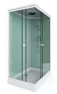 поддон низкий 15см (прямоугольный) фронтальные стекла: матовые фактурные задние стекла : белые матовые белый алюминиевый профиль регулируемые ролики белые ручки для дверей 2- режимный смеситель ручная лейка (на стенке) слив с сифоном крыша с верхней лейкой