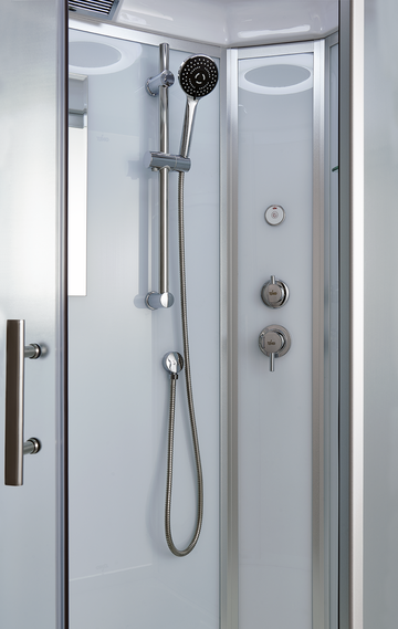 Внутреннее строение: Кабина оснащена верхним освещением, тропическим (верхним) душем, зеркалом и полками для удобства хранения и использования различных средств гигиены.