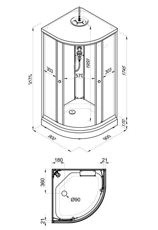 Душевая кабина с крышей ДК Ультра 90*90 А, 7 мест+сифон D90 Размер: 90 x 90 x 217.5 см ... Подробнее