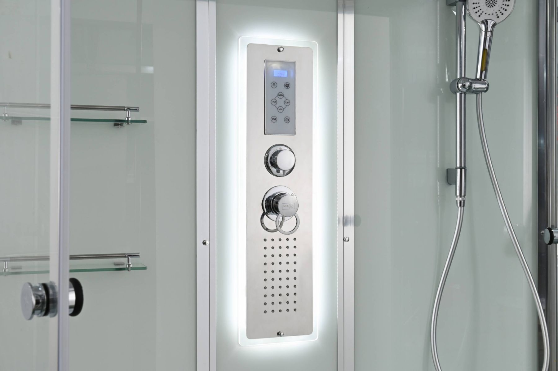 Стильная душевая кабина AvaCan сочетает в себе высокую функциональность, практичность и надежность. При изготовлении применяется безопасное закаленное стекло, надежно фиксируемое алюминиевым профилем.Профиль сделан из алюминия повышенной прочности. Сборка без силикона (увеличивает срок службы, защищает от протечек), внутренняя сборка (облегчает установку и ревизию; позволяет установить в ограниченном пространстве и обойтись без демонтажа других сантехнических приборов), смеситель резьбовой (без хомутов). Съемный экран поддона (позволяет осуществлять подключение и ревизию сифона).Двойные металлические ролики дверей (распределение нагрузки на два ролика, увеличивают срок службы). Душевая штанга(позволяет регулировать по высоте ручную лейку), ручная арома-лейка с витамином С (картридж в комплекте,есть возможность замены или удаления картриджа), полочки(из стекла, с ограничителем), сифон с гидрозатвором, сенсорный пульт управления с функциями: блютуз, LED подсветка, радио, вытяжка, гидромассаж спины, тропический (верхний) душ.