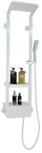- Комплектация: душевая панель с верхним душем, душевая лейка, смеситель, шланг для душа, полочка, крепеж, инструкция