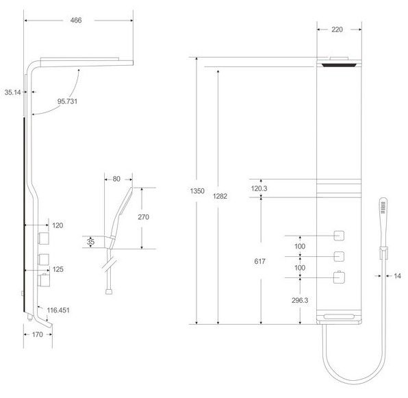 • Комплектация: душевая панель, душевая лейка, смеситель, шланг для душа, термостат, крепеж, инструкция