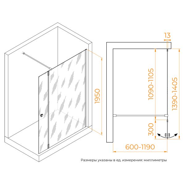 Душевая перегородка состоит из стационарного полотна и полотна с поворотной маятниковой частью - 300 мм. Стационарное стекольное полотно крепится к стене алюминиевым профилем с декоративной заглушкой. Подвижное полотно закреплено стальной маятниковой петлей с ходом 180 градусов.Перегородка выпускается с фурнитурой в 3-х вариантах: