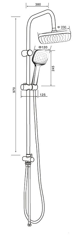 Душевая система в комплекте: однозахватный смеситель для ванны с изливом (190 мм.) и керамическим картриджем, верхний душ 230х230 мм. и ручной душ 120 мм (1 режим) с защитой от известкового налета, регулируемый по наклону держатель верхнего и ручного душа, душевой шланг 1,5 м. (в металлической оплетке, с защитой от перекручивания), керамический дивертор. Штанга 970 мм. с возможностью установки в старые отверстия. Цвет глянцевый белый.