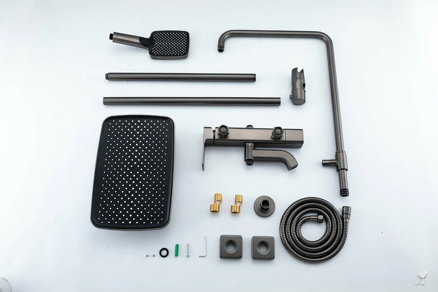 В комплект также входит душевая штанга, ручной душ с 3 режимами работы и шланг длиной 1500 мм. Держатель для лейки и кронштейн для верхнего душа входят в комплект, что обеспечивает удобство использования и хранения.