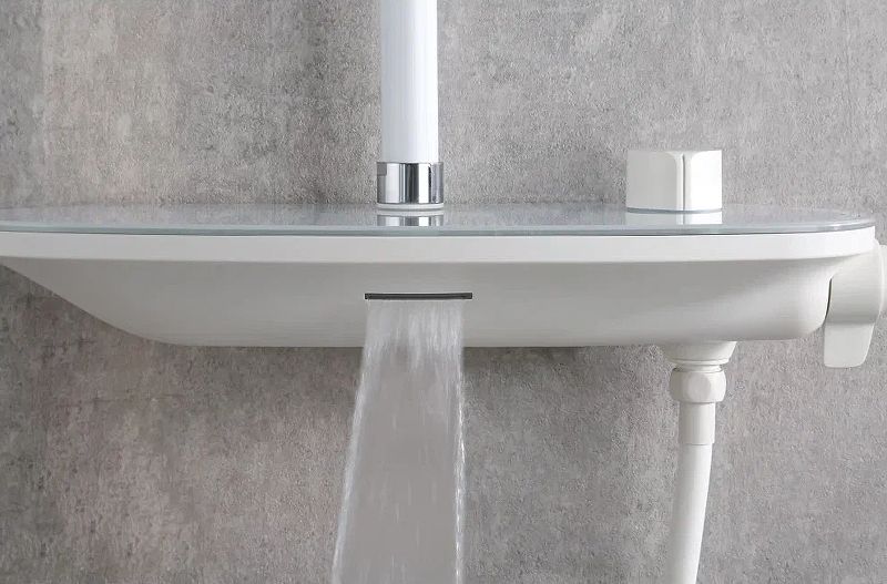 Душевая система со смесителем полкой Gappo G2495-88 в белом матовом цвете, регулировка воды поворотом ручки, включение/выключение нажатием кнопки, каскадный аэратор (водопад). Смеситель изготовлен из латуни, ручной душ с 3-мя режимами работы.