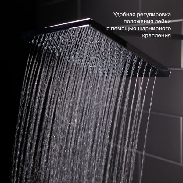 Смеситель для ванны Bild с верхним душем отличают выраженные геометрические формы и уникальный дизайн ручки-петли с тонкой изящной рамкой. Толщина рамки составляет всего 2 мм, при этом прочность ручки не снижается — она прослужит долгие годы. Излив эстетично интегрирован в корпус, вода из него поступает в ванну под комфортным углом. Стойка удобно регулируется по высоте.