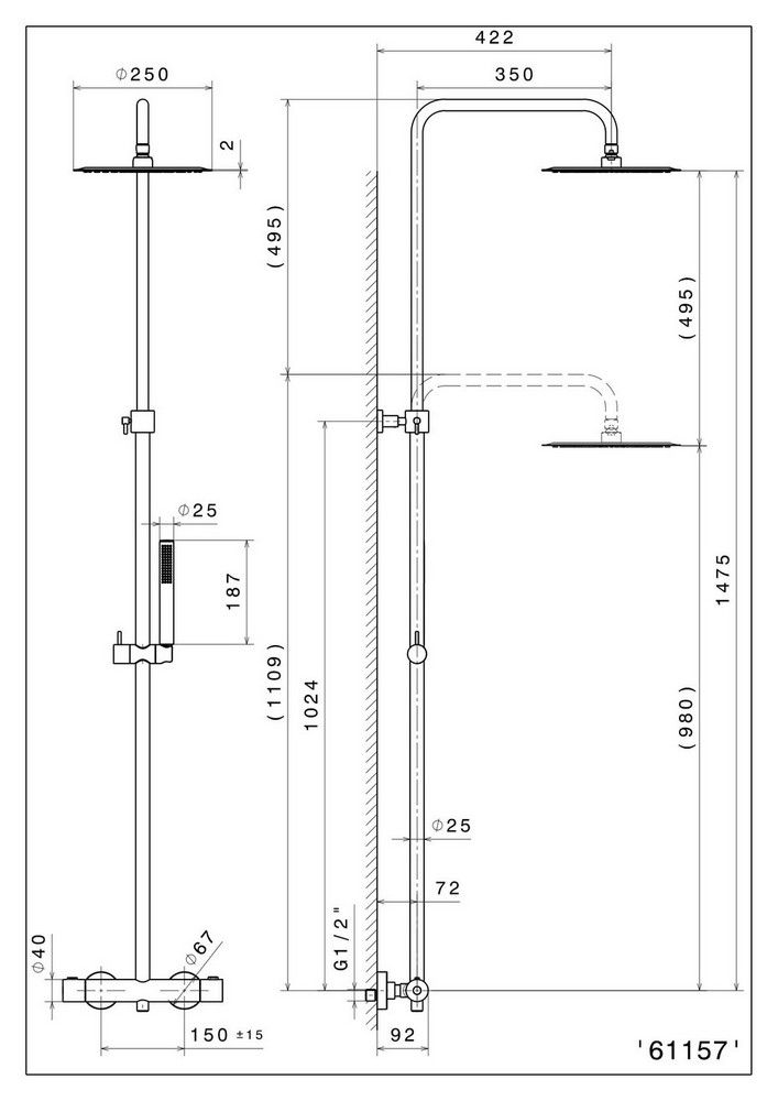 Душевая колонна с термостатическим смесителем в комплекте с переключателем потоков, круглой верхней одноструйной душевой лейкой из нержавеющей стали, с ручным душем и шлангом из ПВХ.