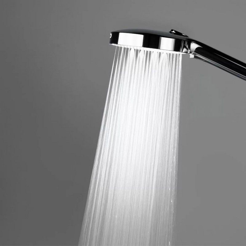 Верхний душ и ручная лейка имеют форму круга. Стойка выполнена из нержавеющей стали, круглая в сечении. У ручной лейки предусмотрены четыре режима потока. Регулировка высоты при установке – 1114-1874 мм.