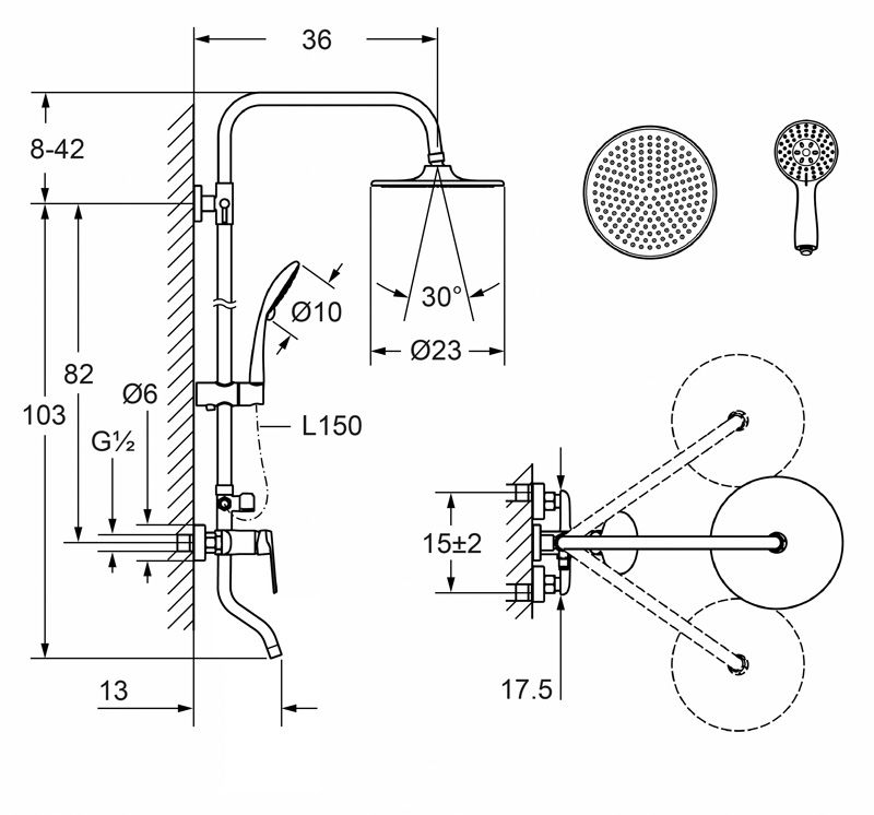 Вылет верхнего душа, см 36
