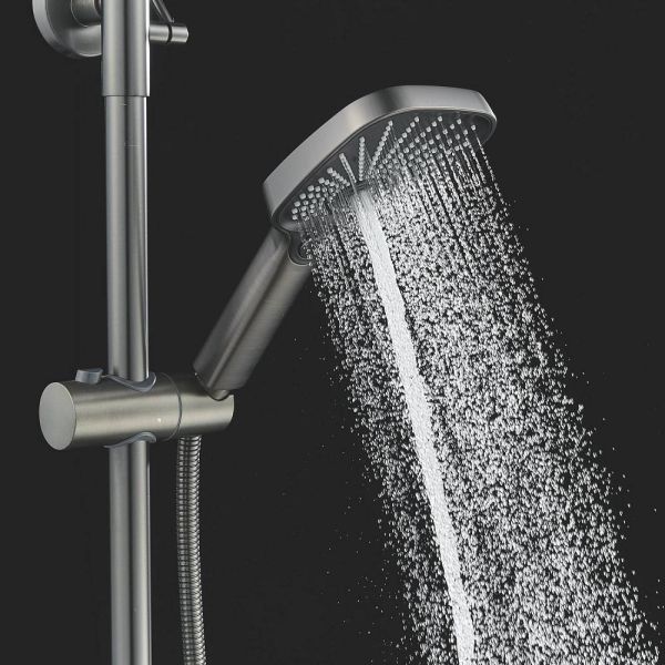 Верхний душ размером 300x190 мм из ABS-пластика регулируется по высоте благодаря телескопической штанге и по наклону с помощью встроенного шарнира, что обеспечивает максимальный комфорт и удобство использования. Самоочищающиеся силиконовые форсунки предотвращают образование известкового налета и сохраняют чистоту и силу потока воды.