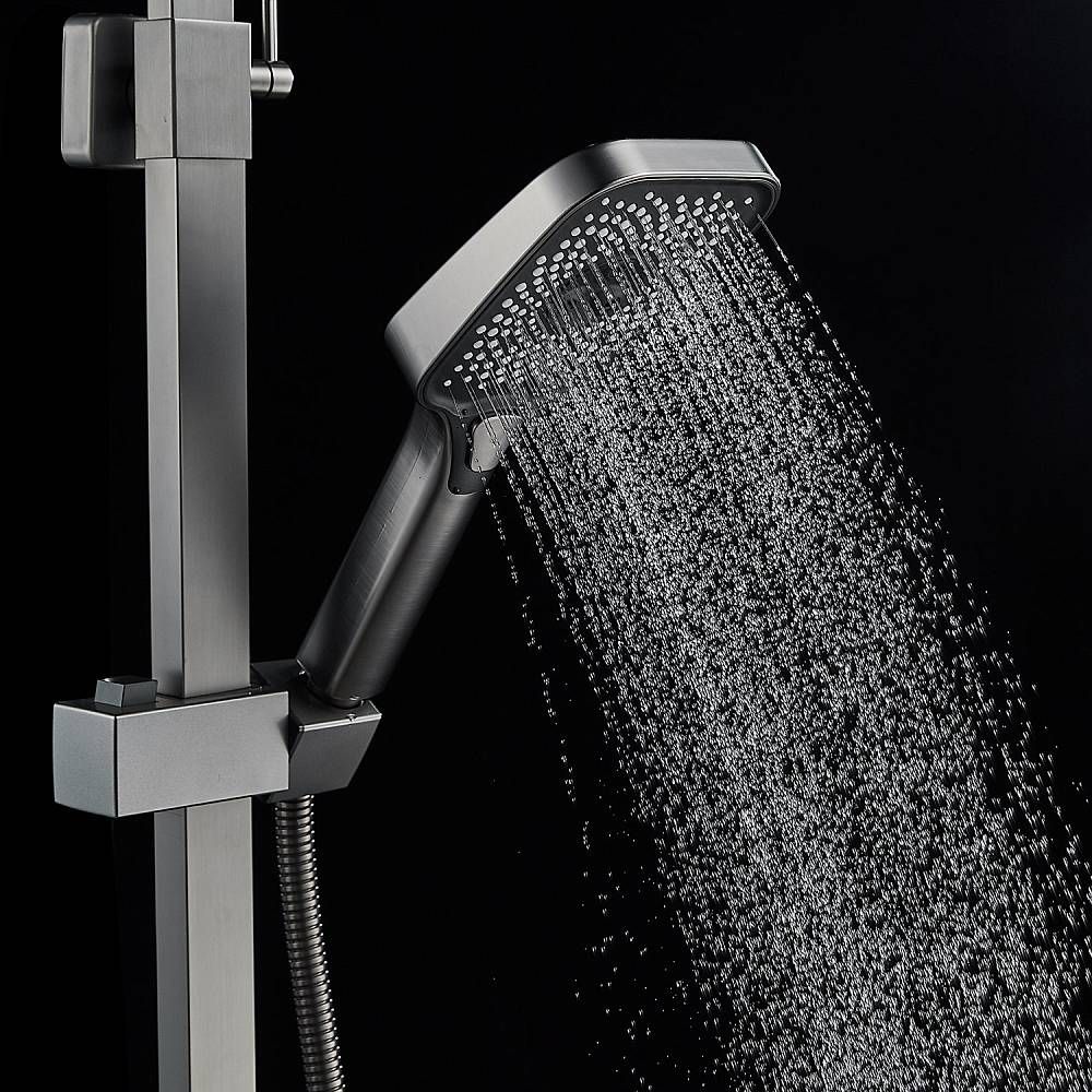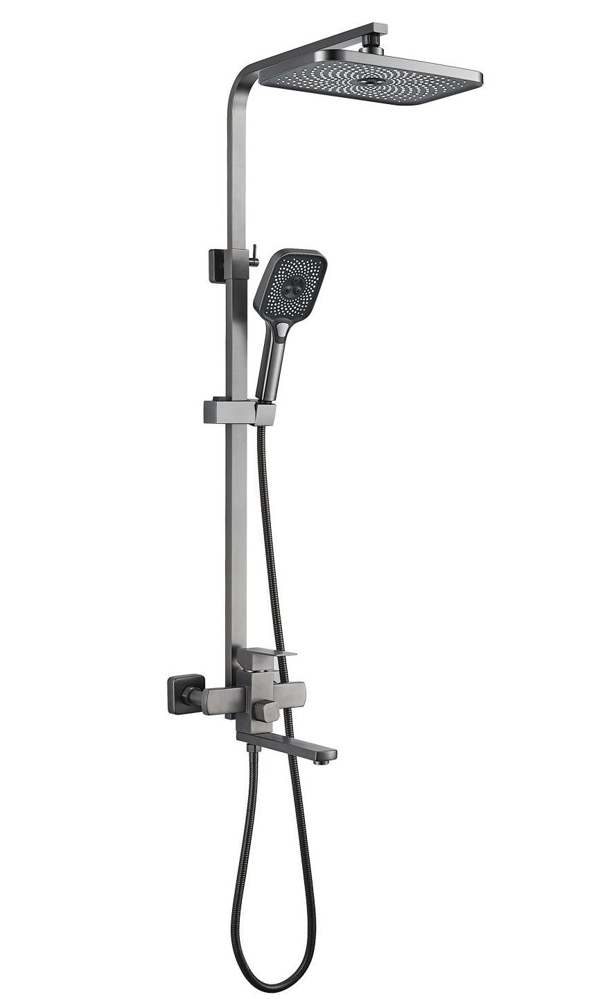 Душевая система Shevanik S7036T, оружейная сталь.Количество режимов струи: 3.Размер верхнего душа: 29x19,5 см.Управление: рычажное.Излив для наполнения ванны: да.