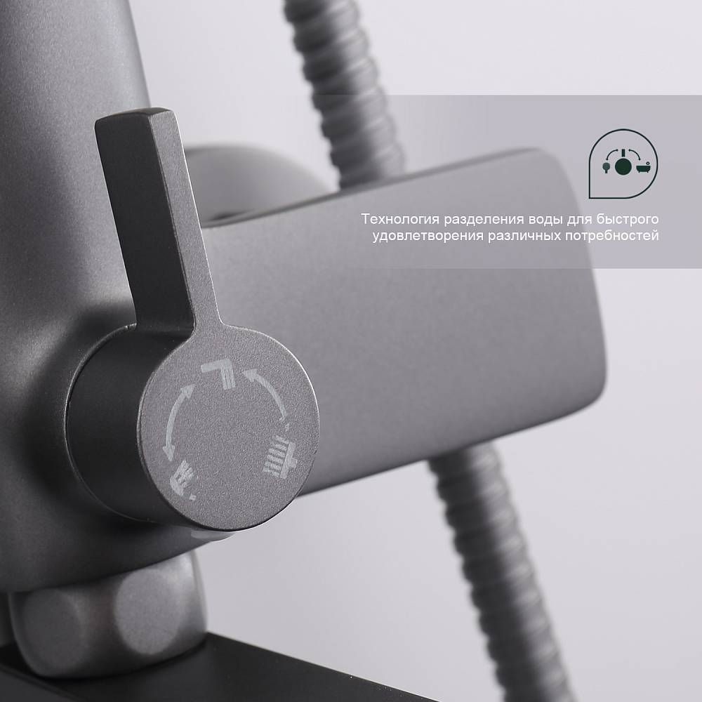 Душевая система Splenka S40.24.07. Цвет: серый. Материал: латунь. Управление: однорычажное. Механизм: керамический картридж. Излив: поворотный. Аэратор. Стандарт подводки: G 1/2. Форма верхнего душа: прямоугольная. Размер верхнего душа (ШхД): 300х190 мм. Количество режимов струи ручного душа: 3. Переключение режимов ручного душа: кнопочное. Регулируемая по высоте душевая штанга: 950-1350 мм. Регулируемый по высоте держатель ручного душа. Монтаж: на стену.