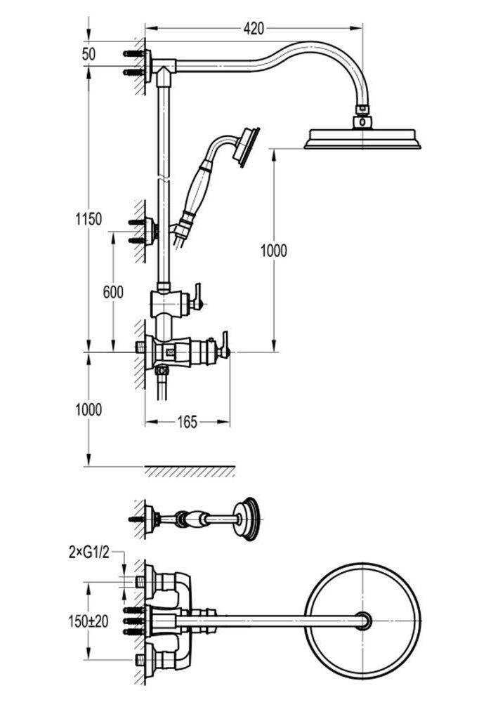Семейный душ с термостатическим смесителем. Латунные трубки. Ручной душ - металл. Верхний душ - ... Подробнее