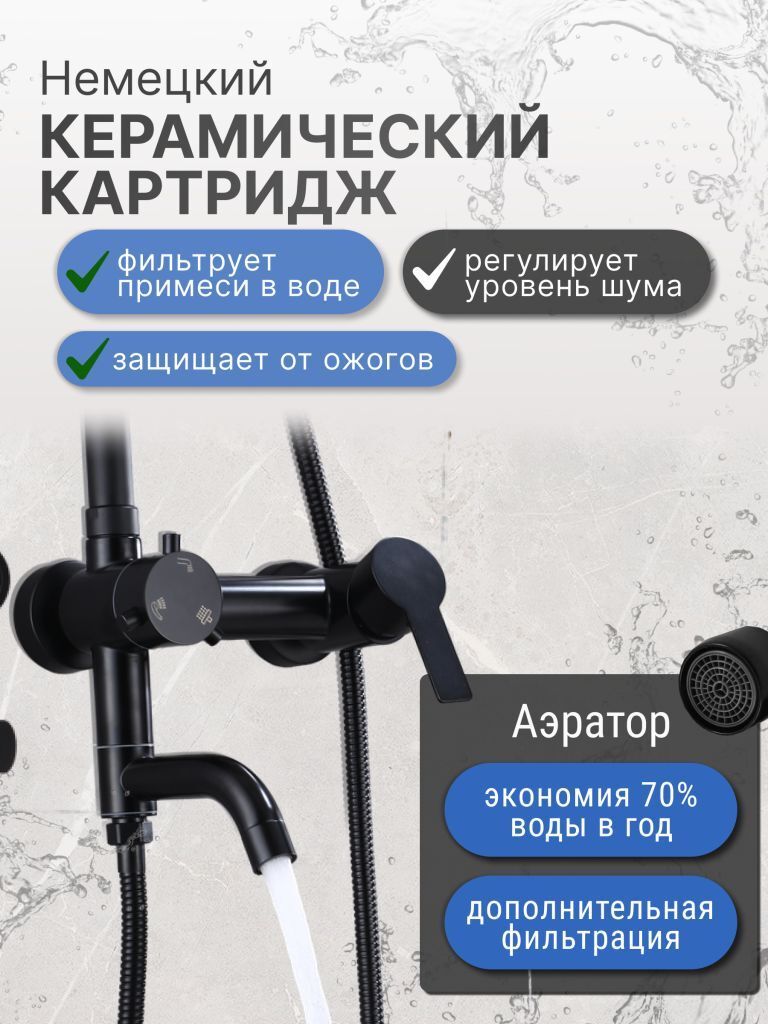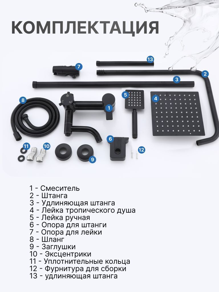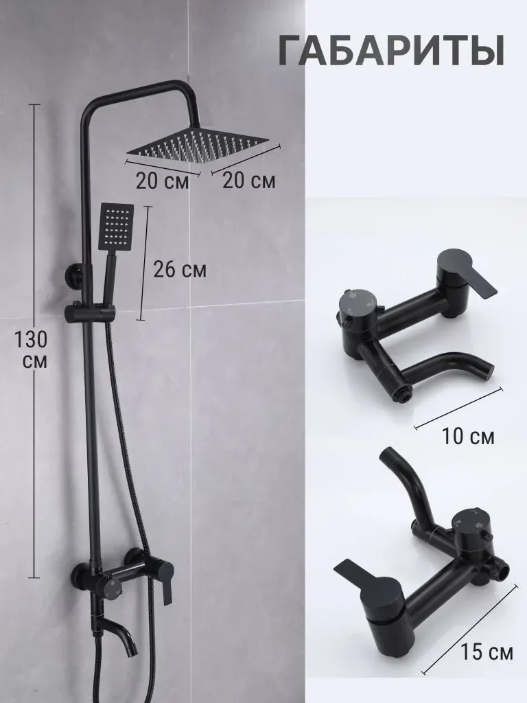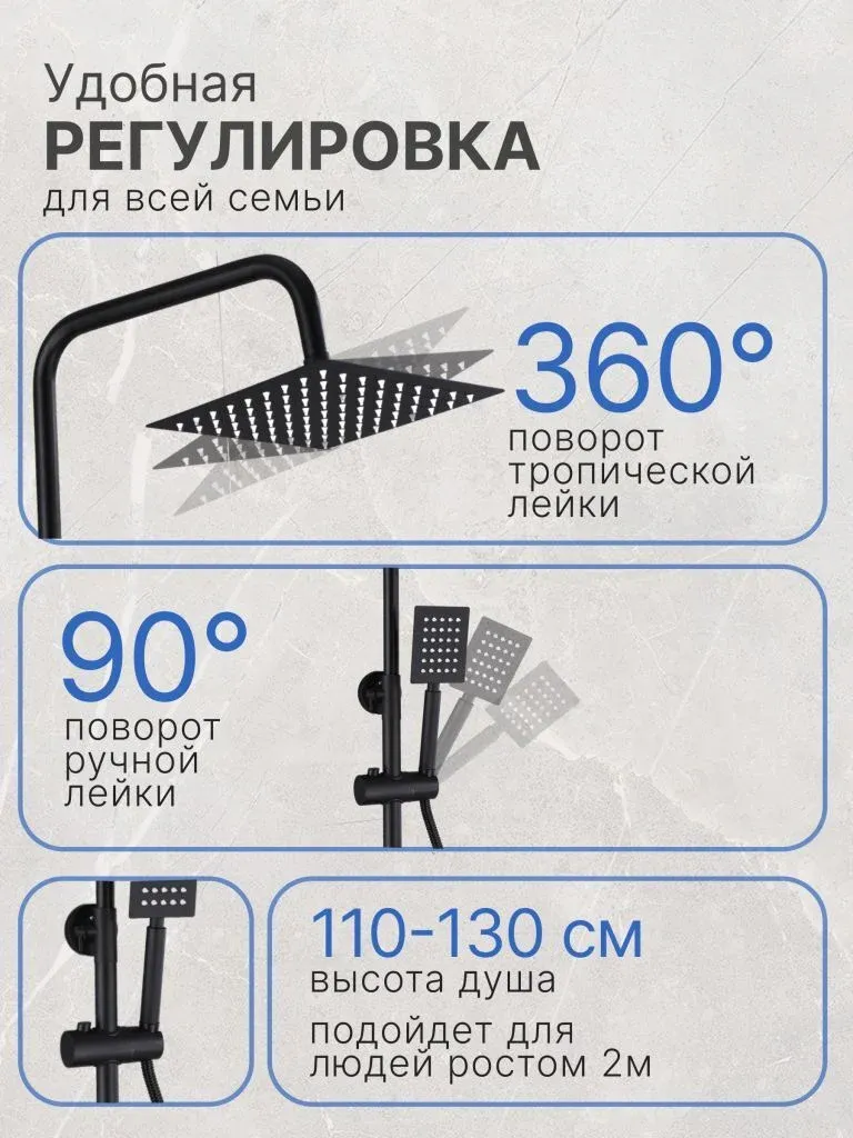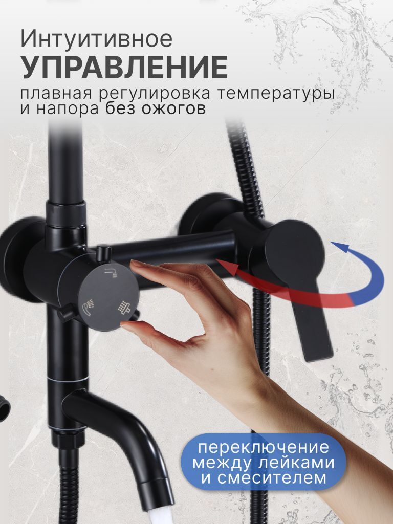 Душевой комплект содержит все необходимое для монтажа. Кроме того, наша душевая стойка черная имеет простой и быстрый монтаж, благодаря чему вы сможете установить ее самостоятельно без привлечения специалистов. Это позволит сэкономить время и деньги, а также получить удовольствие от процесса создания своего уютного уголка в ванной комнате.