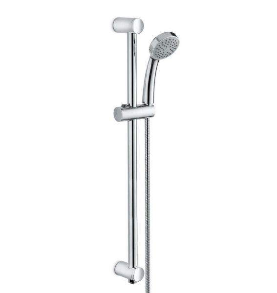 Душевая стойка длиной 150 см, с подвижным держателем лейки ручного душа из пластика и шлангом из ПВХ. Без выхода для подачи воды.
